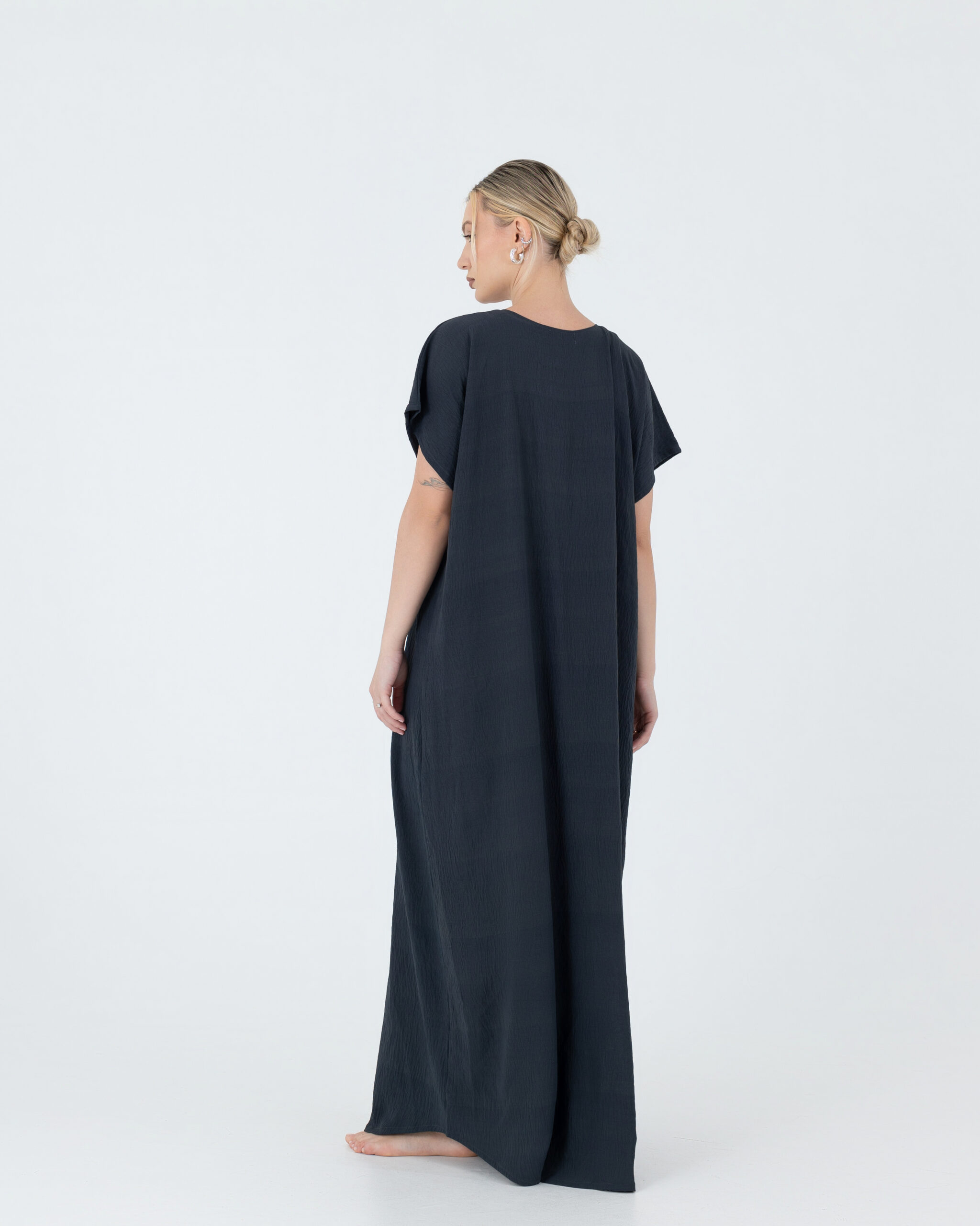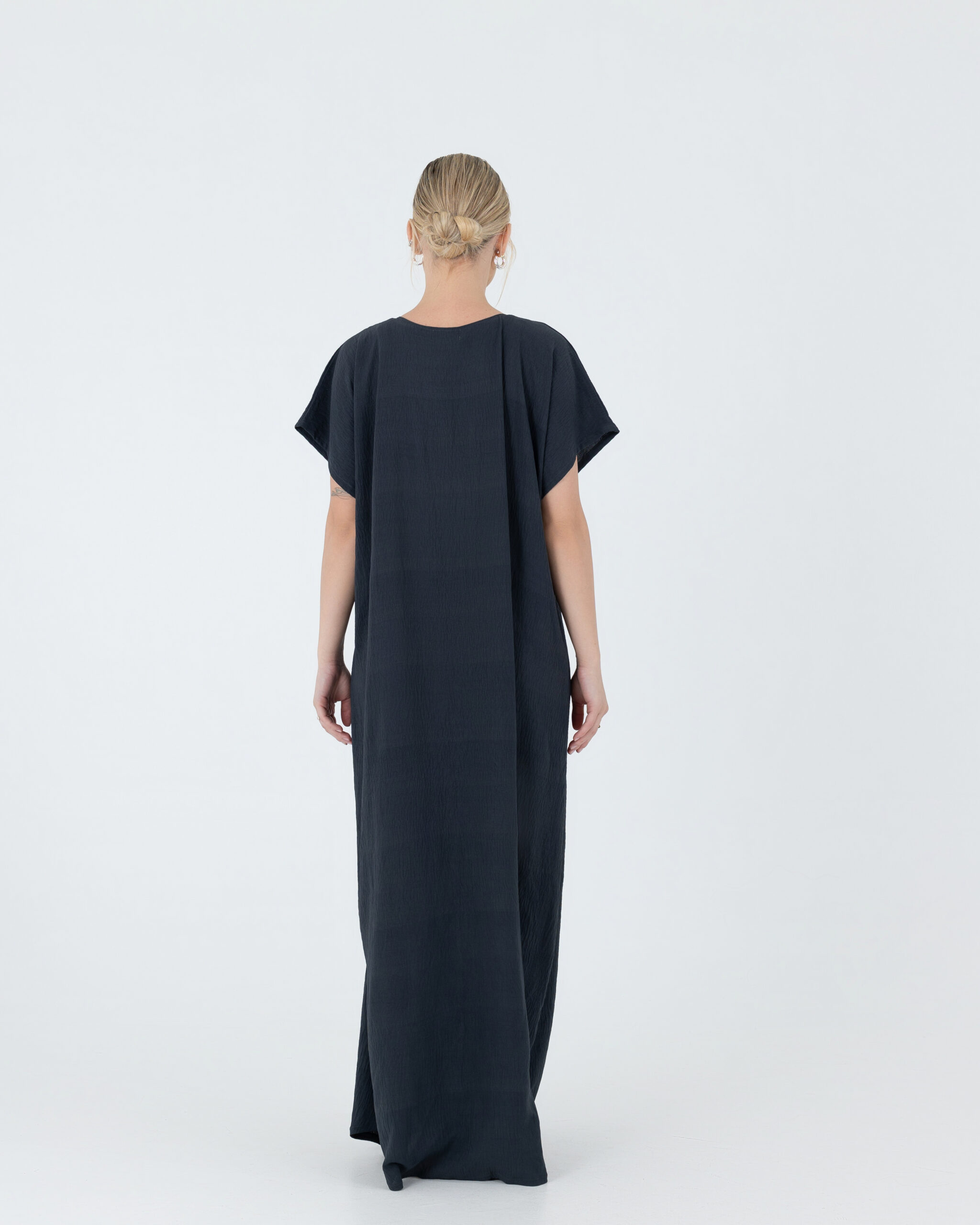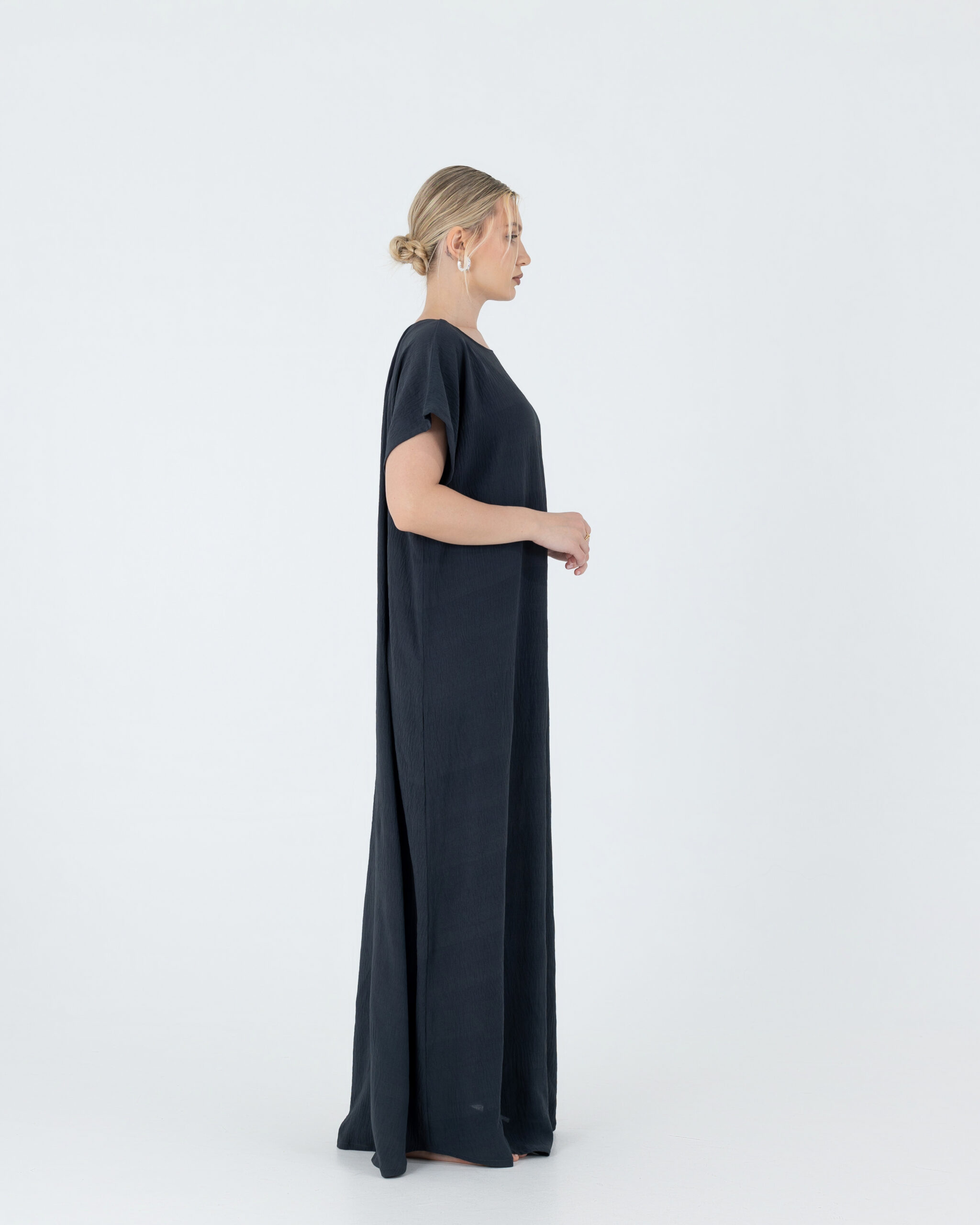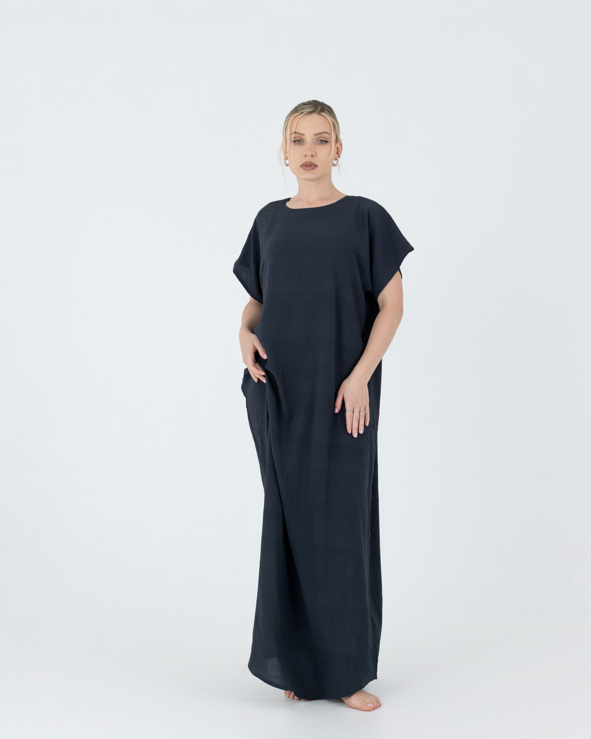 The tunic features a relaxed fit with a flattering silhouette that gracefully cascades over the body, making it suitable for all body types. Its classic Petrol Blue hue provides a timeless foundation, allowing for versatile styling options—dress it up for a night out or keep it casual for an everyday ensemble.